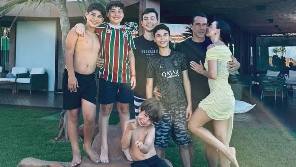 Isis Valverde posa agarradinha com Marcus Buaiz em foto com filho e enteados: ‘Nós’