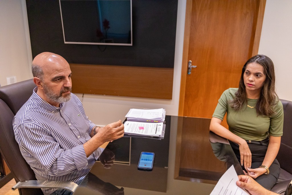 A matéria é ilustrada por imagem do secretário Amauri Monge fazendo uso da palavra, observado por uma participante da reunião.