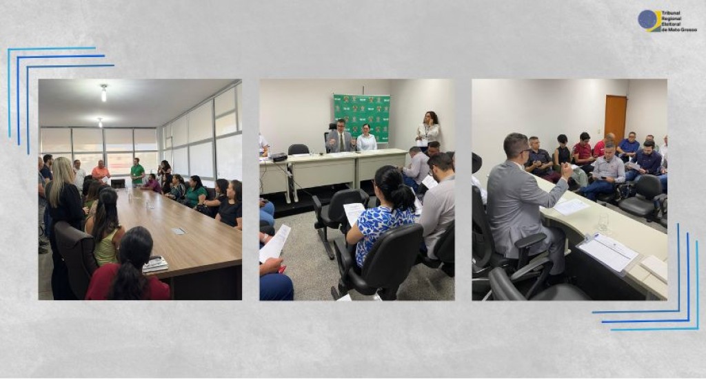 #PraTodosVerem: A imagem é composta por três fotografias lado a lado que mostram diferentes reuniões institucionais em ambientes de escritório. Nas cenas, pessoas estão sentadas em torno de mesas ou em cadeiras dispostas em fileiras, ouvindo atentamente apresentações e discussões conduzidas por representantes posicionados à frente. O cenário transmite um ambiente formal de trabalho, voltado ao diálogo e à tomada de decisões coletivas, com o logotipo do Tribunal Regional Eleitoral de Mato Grosso (TRE-MT) no canto superior direito da montagem.