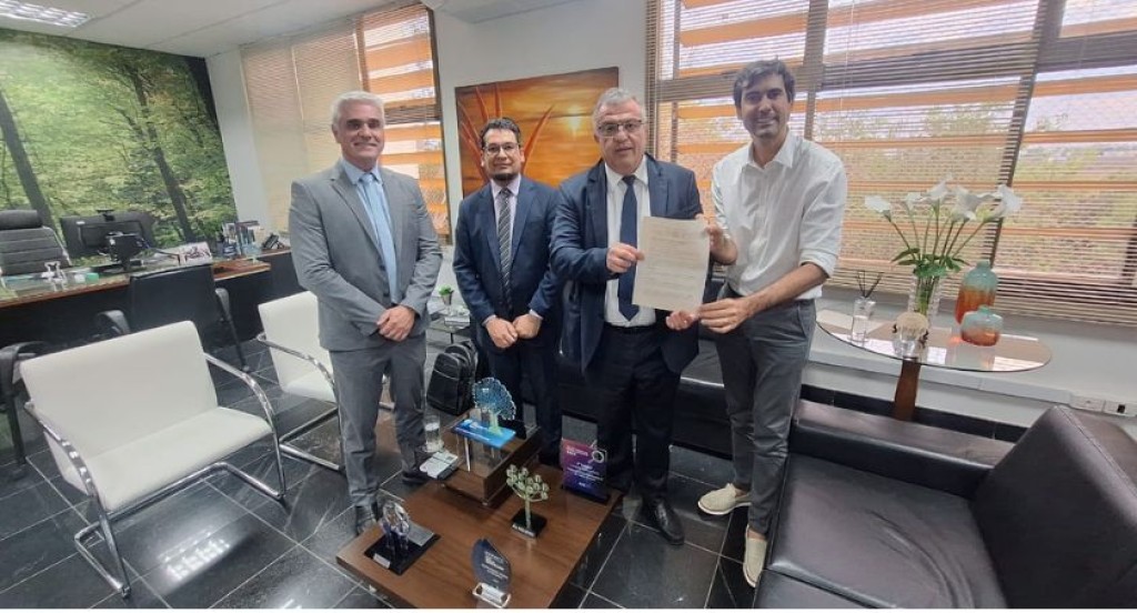 #PraTodosVerem – A imagem mostra quatro homens em trajes formais posando para a foto em um ambiente de escritório, entre eles o desembargador Marcos Henrique Machado e o prefeito de Campo Verde, Alexandre Lopes de Oliveira. Um deles segura um documento, enquanto os demais o acompanham, sugerindo a assinatura ou entrega oficial de um termo ou parceria. Ao fundo, há janelas amplas com persianas, mesas, cadeiras e objetos decorativos, reforçando o caráter institucional da reunião.