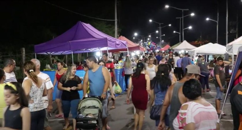#PraTodosVerem – A imagem mostra uma feira noturna movimentada, com várias barracas coloridas montadas ao longo da rua e muitas pessoas circulando entre os estandes. O ambiente é iluminado por postes de luz e tende a ser descontraído, com famílias, casais e grupos de amigos aproveitando o evento sob o céu noturno.