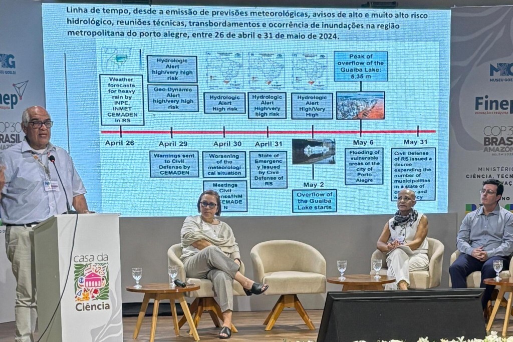 No segundo dia de mesas redondas da Casa da Ciência, o tema debatido foi Desastres Climáticos no Brasil e no Mundo, com um momento para conversas sobre os Sistemas de Alertas para Ameaças Múltiplas. A diretora do Centro Nacional de Monitoramento e Alertas de Desastres Naturais (Cemaden), Regina Alvalá, afirmou que a meta é aumentar o número de municípios monitorados até 2026.