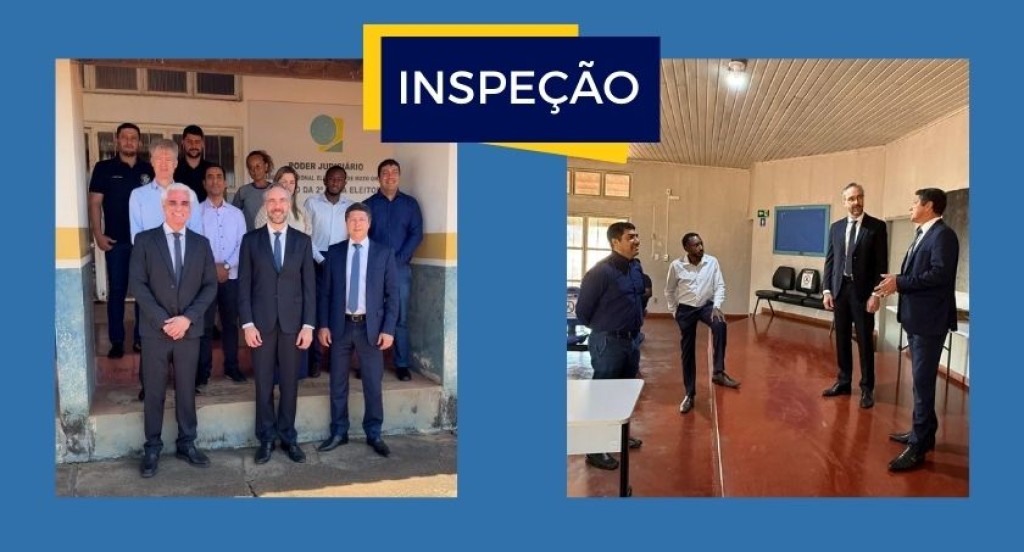 #PraTodosVerem: A imagem está dividida em duas partes: à esquerda, um grupo de homens, alguns de terno e outros com roupas sociais, posam para foto em frente a um prédio da Justiça Eleitoral; à direita, três deles conversam em uma sala simples, acompanhados por outros servidores. No alto, há uma faixa azul com a palavra “INSPEÇÃO”, indicando que se trata de uma visita institucional de acompanhamento dos trabalhos eleitorais.