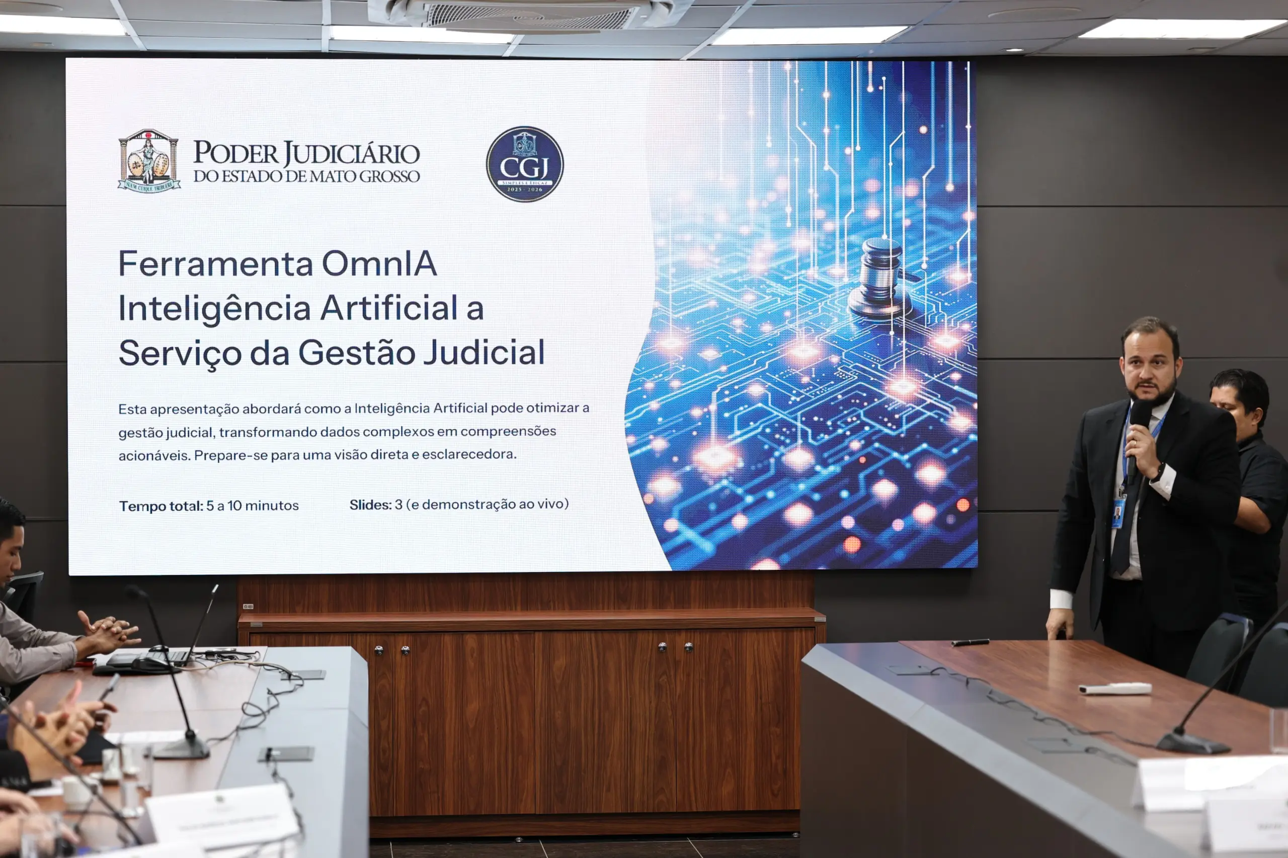 A equipe técnica do Departamento de Aprimoramento da Primeira Instância (DAPI), da Corregedoria-Geral da Justiça de Mato Grosso, apresentou, na tarde desta quinta-feira (29), a ferramenta OmnIA à comitiva do Conselho Nacional de Justiça (CNJ). A apresentação foi realizada na sala de reuniões da Presidência do Tribunal de Justiça de Mato Grosso (TJMT).Participaram do encontro integrantes da comitiva do CNJ, o desembargador Luiz Octávio Oliveira Saboia Ribeiro, presidente do Comitê de Governança de Inteligência Artificial (CGEIA), o juiz auxiliar da Corregedoria, Jorge Alexandre Martins Ferreira, o coordenador da Corregedoria, João Gualberto Nogueira Neto, o diretor do DAPI, Guilherme Felipe Shultz, além de servidores do Poder Judiciário.