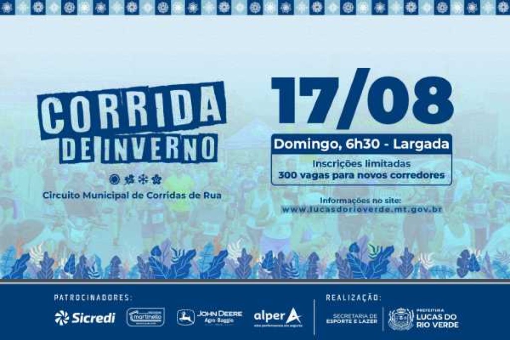 A partir das 19h30 desta quarta-feira (30), estarão abertas as inscrições para a Corrida de Inverno, terceira etapa do Circuito Municipal de Corridas de Rua. Tradicional no calendário esportivo local, a prova será realizada no dia 17 de agosto, com largada às 6h30, no Lago Harri Muller. O evento é uma realização da Prefeitura de Lucas do Rio Verde, por meio da Secretaria de Esporte e Lazer.