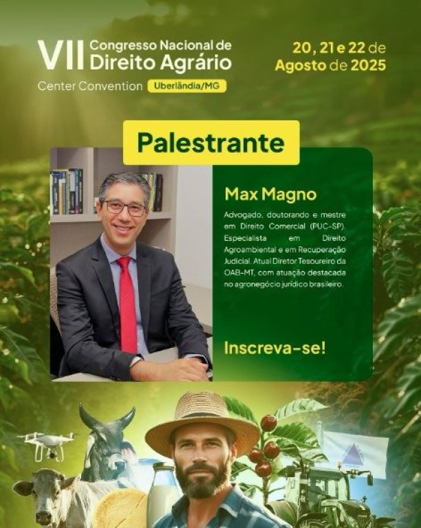 O VII Congresso Nacional de Direito Agrário 2025 tem como tema “Agronegócio e Segurança Jurídica: O Direito, o Judiciário e a estabilidade do produtor rural e da atividade agrária”. Serão mais de dez painéis tratando de diversos conteúdos relacionamos a temática, além de o UBAUTalks – que promoverão discussões práticas sobre a advocacia e o direito aplicado ao agronegócio. O painel que contará com a palestra do diretor-tesoureiro da OAB-MT, Max Ferreira Mendes, será sobre Processo Civil Aplicado ao Agronegócio.