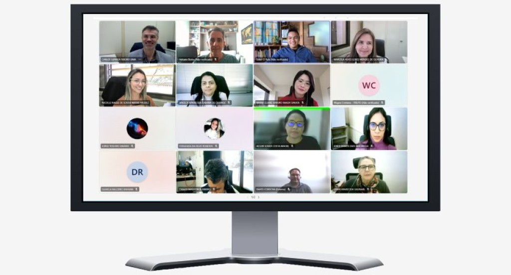 #PraTodosVerem: A imagem mostra uma videoconferência com a participação de diversas pessoas, distribuídas em janelas individuais. A maioria está com a câmera ligada, aparecendo sorridentes ou concentradas, enquanto algumas exibem apenas avatares ou imagens de perfil. Cada janela está identificada com o nome do participante, e alguns têm o microfone silenciado. O ambiente de fundo varia entre escritórios, salas residenciais e imagens genéricas, evidenciando um encontro remoto entre profissionais de diferentes locais.