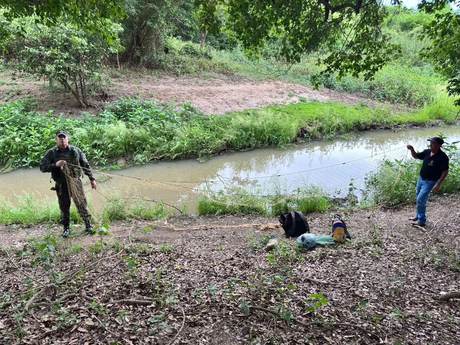 Durante a abordagem de um dos indivíduos, não foram encontrados materiais ilícitos com ele, mas nas mochilas abandonadas havia uma porção de maconha e apetrechos de pesca, como uma tarrafa, uma rede de arrasto de aproximadamente 20 metros e linhadas de mão.