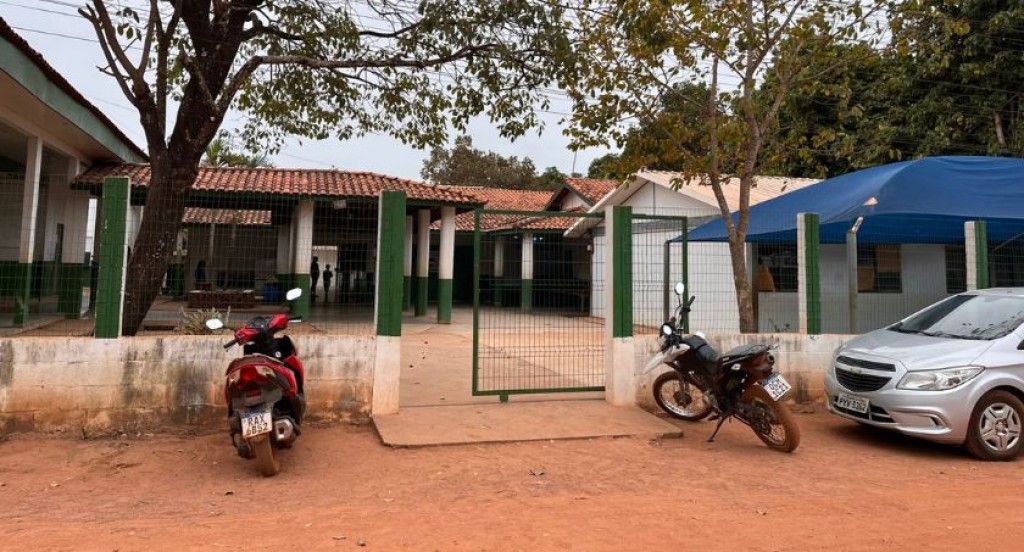 #PraTodosVerem – A imagem mostra a entrada da Escola Municipal Rural de Educação Básica Nova Esperança com estrutura simples, muros baixos, portão de grade verde e telhado de telhas cerâmicas. Há duas motos e um carro estacionados em frente, sobre um chão de terra batida. À direita, uma cobertura azul foi instalada na parte interna das instalações. Algumas pessoas podem ser vistas ao fundo, nas dependências da unidade escolar.