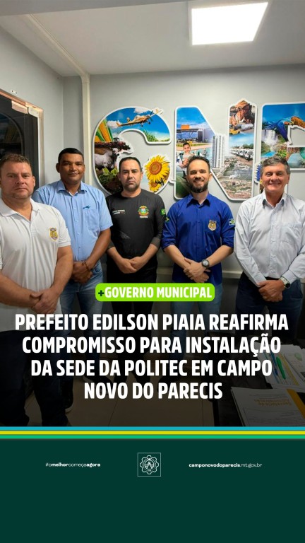 O Governo Municipal de Campo Novo do Parecis recebeu, nesta semana, a equipe da Perícia Oficial e Identificação Técnica (Politec) para dar continuidade ao alinhamento referente à instalação da sede do órgão no município. A visita reforça o compromisso do Estado em ampliar a estrutura de atendimento e fortalecer os serviços de identificação civil e perícia técnica na região.