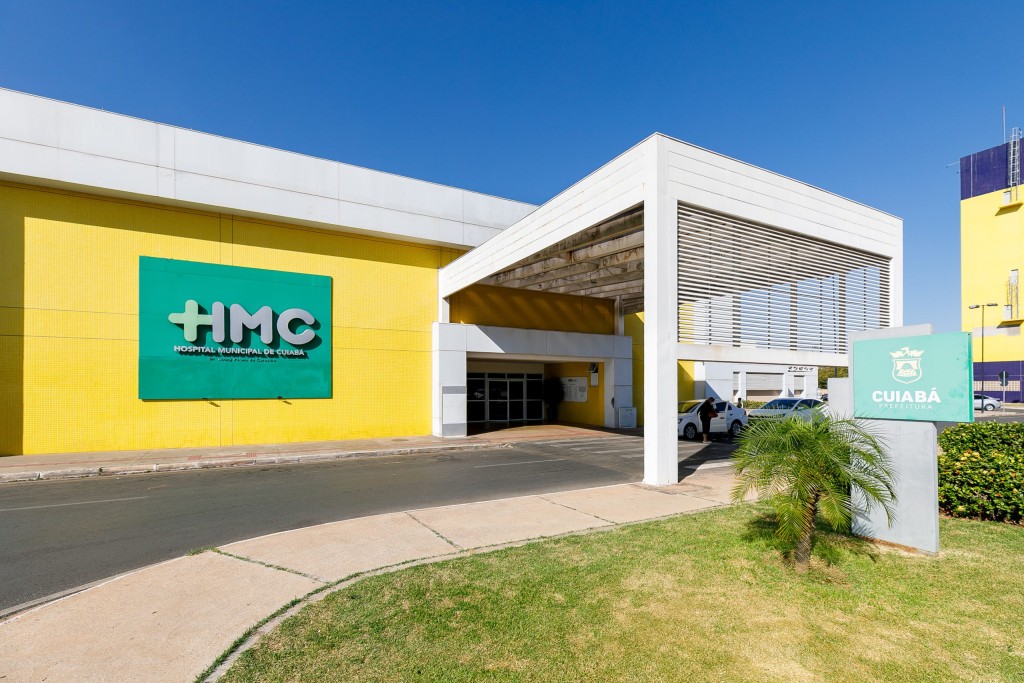 A imagem ilustra a fachada do Hospital Municipal de Cuiabá. A unidade possui as cores verde e amarela.