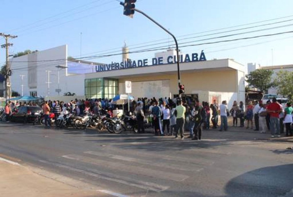 A foto mostra a fachada da Universidade de Cuiabá, local do evento, com o público em busca de uma vaga de emprego na Feira de Empregabilidade realizada no ano passado.