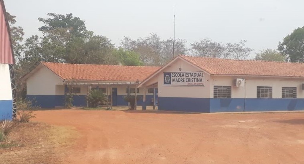 #PraTodosVerem: A fotografia mostra a Escola Estadual Madre Cristina, com paredes em cor branca e azul. É possível ver duas construções frente a frente, com um pátio entre elas. No canto esquerdo, é possível identificar parte da estrutura de um ginásio escolar. O chão é de terra, com árvores ao fundo.