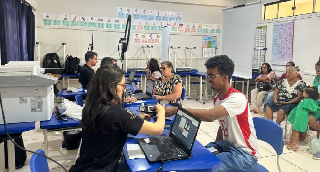 #PraTodosVerem: A imagem mostra um ambiente de atendimento ao público, realizado dentro de uma sala de aula adaptada. Nas mesas estão dispostos computadores e equipamentos de registro, onde servidores atendem cidadãos para coleta de dados, como impressões digitais e documentos. Ao fundo, outras pessoas aguardam sentadas em fila. O cenário evidencia um mutirão de serviços, com foco em cadastro ou regularização, em um espaço simples e organizado.