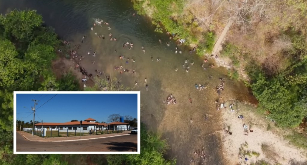 #PraTodosVerem – A imagem principal mostra o leito do rio Coxipó, no distrito do Coxipó do Ouro, com águas limpas e rasas, cercado por vegetação, onde diversas pessoas estão reunidas para banho e lazer. No canto inferior esquerdo, há uma foto menor sobreposta que retrata a fachada da Escola Municipal de Educação Básica do Campo (EMEBC) “Nossa Senhora da Penha de França”, em Cuiabá, com estrutura ampla, cercada e pintada em tons claros, localizada à beira de uma rua pavimentada, local do mutirão da Justiça Eleitoral.