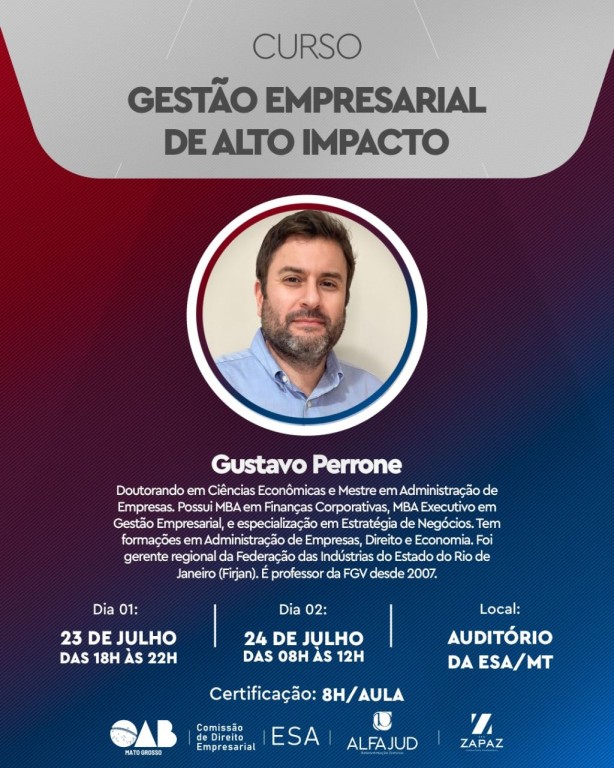 A Ordem dos Advogados do Brasil – Seccional Mato Grosso (OAB-MT), por meio da Escola Superior da Advocacia (ESA-MT), realiza nos dias 23 e 24 de julho o curso Gestão Empresarial de Alto Impacto. “Um curso preparado para advogados e advogadas que são líderes, que lidam no dia a dia com os desafios de uma gestão. Oportunidade imperdível de capacitação”, diz Gisela Cardoso, presidente da OAB-MT. O curso é uma iniciativa da Comissão de Direito Empresarial da OAB-MT que constatou a necessidade de oferecer esse conteúdo.