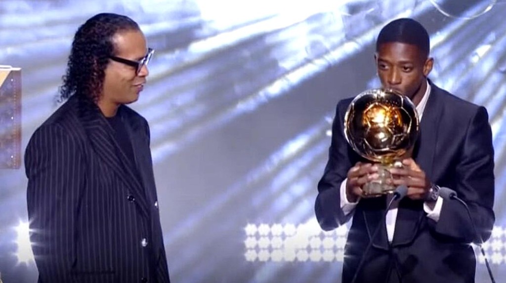 Ronaldinho Gaúcho entrega Bola de Ouro a Ousmane Dembelé, do Paris