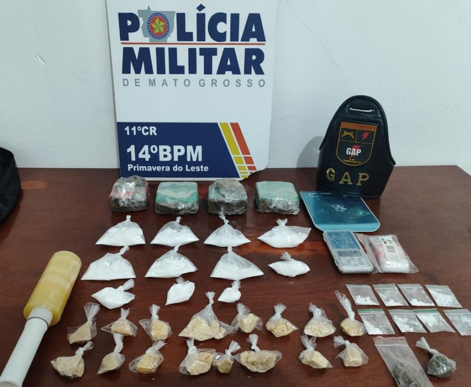 A equipe policial entrou no local e, em um quarto dos fundos, localizaram mais oito porções de cocaína, seis porções de maconha, 16 porções de pasta base, além de material para preparo da droga.