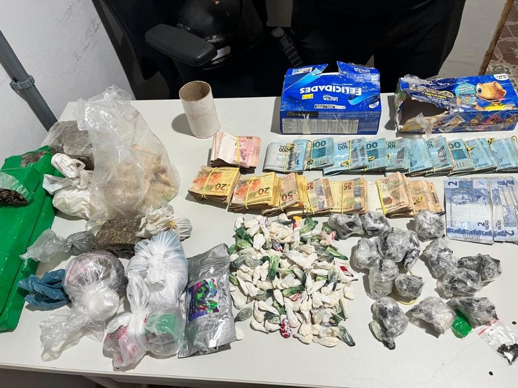 Durante o cumprimento dos mandados, foram apreendidas grandes quantidades de entorpecentes, entre maconha, pasta base e cocaína, além de cestas básicas ofertadas pela facção criminosa a seus colaboradores como auxílio alimentação.