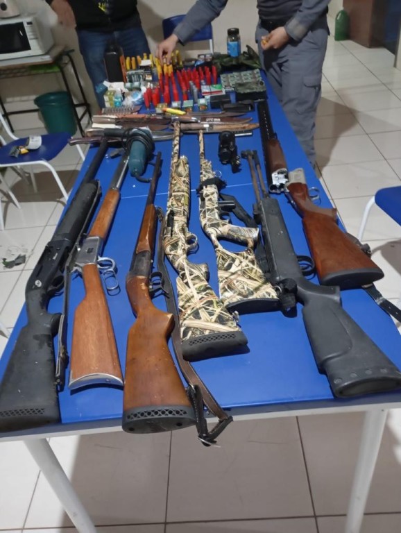 Os policiais recuperaram uma pistola, duas carabinas e cinco espingardas, além de três mil munições de diversos calibres. Com os suspeitos, foram apreendidos R$ 100,00 em dinheiro, dois celulares e onze facas.