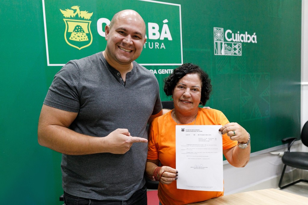 A foto principal destaca o prefeito Abilio Brunini e a vereadora Baixinha Giraldeli após a assinatura do Projeto de Lei, que aconteceu no Salão Nobre da Prefeitura de Cuiabã. Ambos estão em pé, o prefeito com a tradicional camisa cinza e a vereadora de camiseta de cor laranja. Ela segura o documento enquanto o prefeito aponta o documento.
