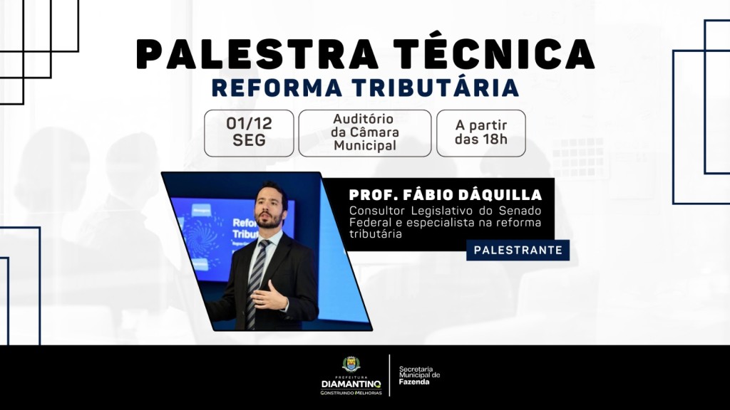 A Prefeitura de Diamantino, por meio da Secretaria Municipal de Fazenda e em parceria com a Academia Brasileira de Formação e Pesquisa (ABFP), realizará no dia 1º de dezembro, às 18h, na Câmara Municipal, um encontro técnico voltado à apresentação e análise dos principais pontos da Reforma Tributária, com ênfase na Contribuição sobre Bens e Serviços (CBS), no Imposto sobre Bens e Serviços (IBS) e no Imposto Seletivo (IS).