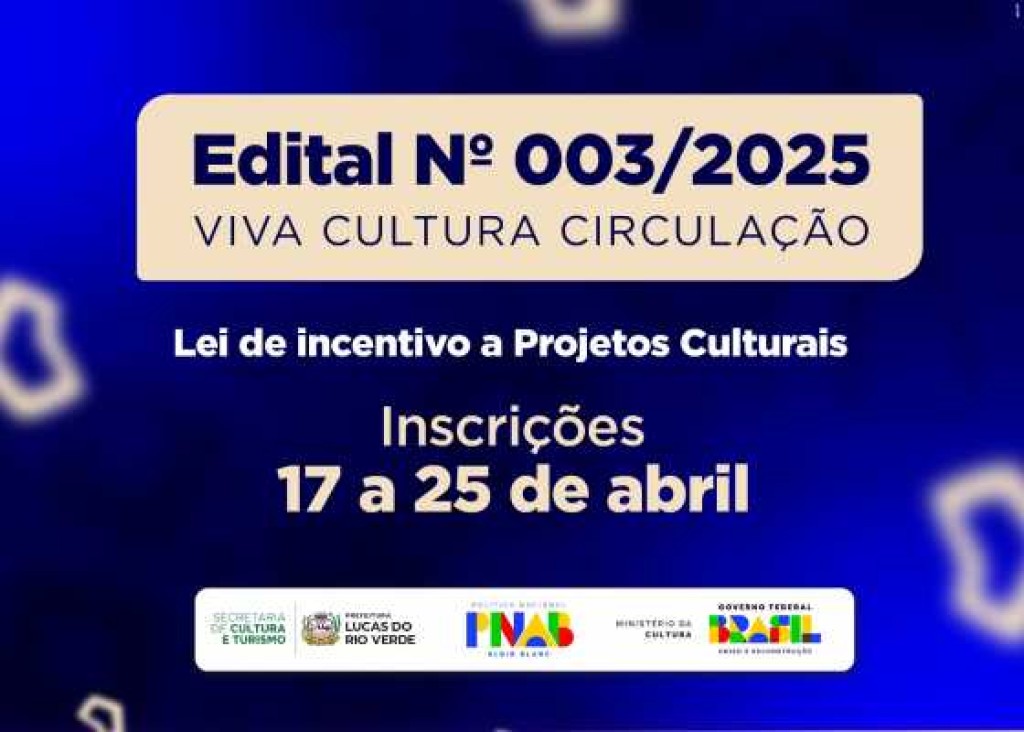 A Prefeitura de Lucas do Rio Verde, por meio da Secretaria de Cultura e Turismo, publicou nesta terça-feira (09), o Edital de Chamamento Público nº 003/2025 – Fomento à Criação de Projetos Culturais, intitulado Viva Cultura Circulação, com recursos da Política Nacional Aldir Blanc de Fomento à Cultura (PNAB) – Lei nº 14.399/2022.
