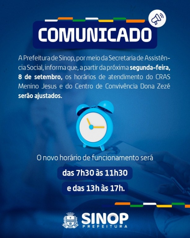 A Prefeitura de Sinop, por meio da Secretaria de Assistência Social, anunciou a alteração no horário de atendimento do CRAS Menino Jesus e do Centro de Convivência Dona Zezé. A partir da próxima segunda-feira (08), as duas unidades passam a funcionar das 7h30 às 11h30 e das 13h às 17h.