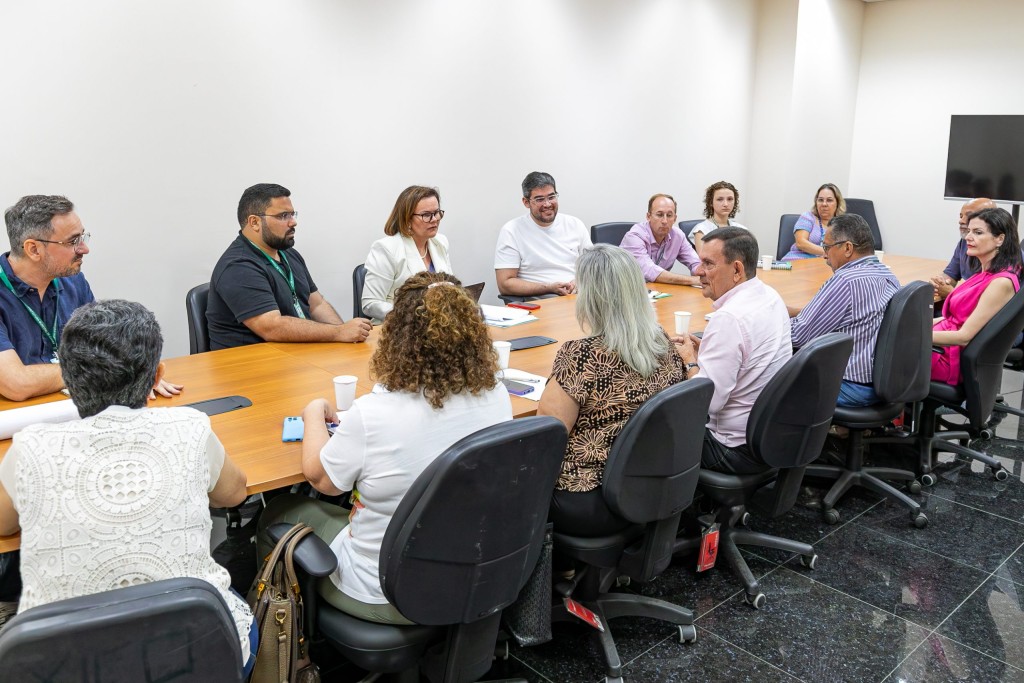 A foto mostra uma mesa de reunião composta por 12 pessoas. Na ocasião, servidores e secretários da Prefeitura de Cuiabá, discutiram o Mercado do Porto com representantes do Ministério Público.