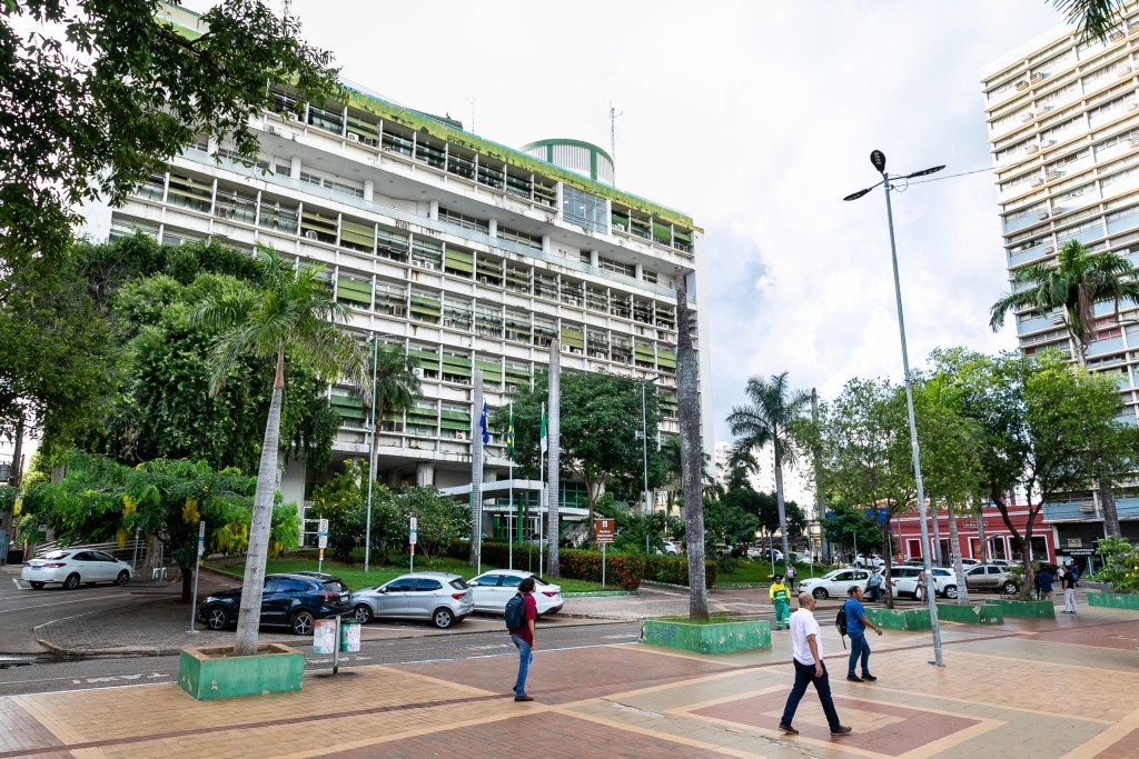 A matéria é ilustrada com imagem do prédio da Prefeitura de Cuiabá nas cores verde e branca. Há destaque também para a Praça Alencastro, na qual estão circulando populares em sentidos distintos.