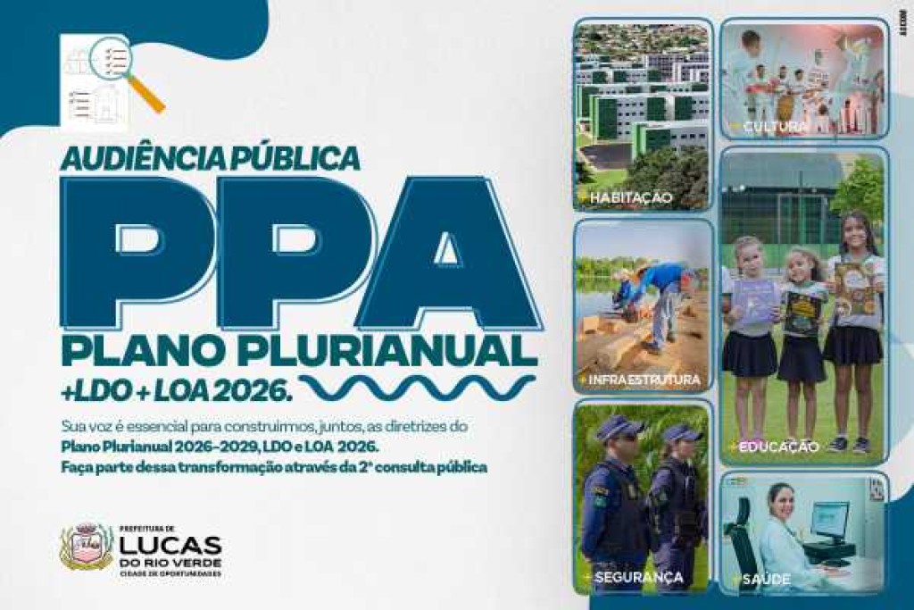 A Prefeitura de Lucas do Rio Verde convida a população para a audiência pública da 2ª Consulta Pública do Plano Plurianual (PPA) 2026–2029, além da Lei de Diretrizes Orçamentárias (LDO) e da Lei Orçamentária Anual (LOA) 2026. O objetivo é ouvir a sociedade sobre suas necessidades e prioridades para os próximos anos, fortalecendo a participação cidadã na construção de políticas públicas.