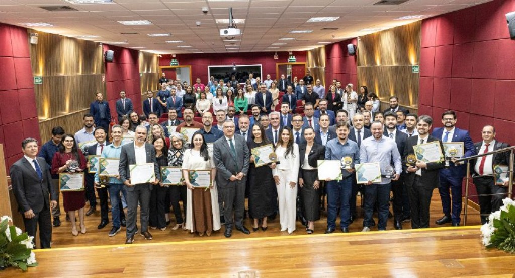 #PraTodosVerem – A imagem mostra a cerimônia de premiação do Prêmio Esemplare, realizada no Plenário do TRE-MT. Na parte da frente, um grande grupo formado pelo corregedor Regional Eleitoral, magistrados, chefes de cartórios e servidores premiados posa para a foto segurando troféus e certificados, enquanto ao fundo aparecem autoridades, familiares e convidados, todos reunidos para prestigiar o evento.