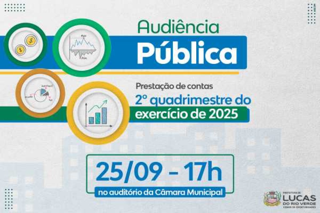 Em conformidade com a Lei de Responsabilidade Fiscal nº 101/2000, a Prefeitura de Lucas do Rio Verde, por meio da Secretaria de Desenvolvimento Econômico, Planejamento e Cidade, realizará uma audiência pública para a prestação de contas do 2º quadrimestre do exercício de 2025. O evento será no dia 25 de setembro, no auditório da Câmara de Vereadores, com início às 17h, e transmitida, de forma on-line, através do canal do Legislativo Municipal no youtube.
