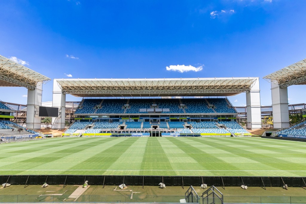 A foto que ilustra o texto mostra ama parcial da área interna da Arena Pantanal, com arquibancada e o gramado. Ao fundo, o céu azulado.