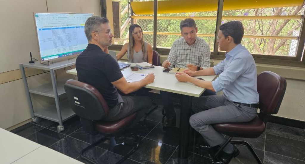 #PraTodosVerem: A imagem mostra quatro pessoas em uma reunião ao redor de uma mesa. Dois homens e uma mulher estão atentos à conversa, tomando notas e discutindo documentos. Ao fundo, há uma tela com uma planilha projetada e uma grande janela com vista para árvores. A cena transmite um ambiente profissional de planejamento e alinhamento de trabalho.
