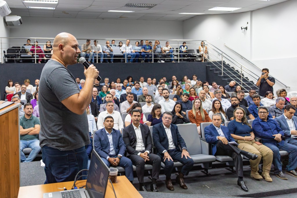 O prefeito Abilio está discursando sobre os planos e estratégias para alcançar os objetivos firmados em campanha. Ao fundo há muitas pessoas sendadas no auditório atentos as suas falas.