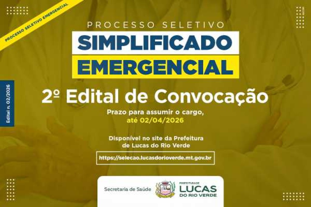 Já está disponível no site da Prefeitura de Lucas do Rio Verde, o segundo edital de convocação de aprovados, referente ao Processo Seletivo Emergencial Simplificado (Edital n. 002/2026).