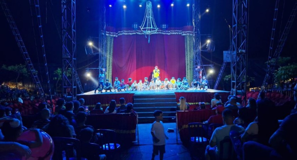 #PraTodosVerem – A imagem mostra o interior de um circo durante uma apresentação noturna. No picadeiro, diversas crianças estão sentadas em fila, acompanhadas por artistas circenses sob luzes azuis e um foco central. Ao fundo, há uma cortina vermelha iluminada e uma estrutura metálica que sustenta o palco. Na plateia, famílias assistem atentamente ao espetáculo, criando um clima de alegria e descontração.
