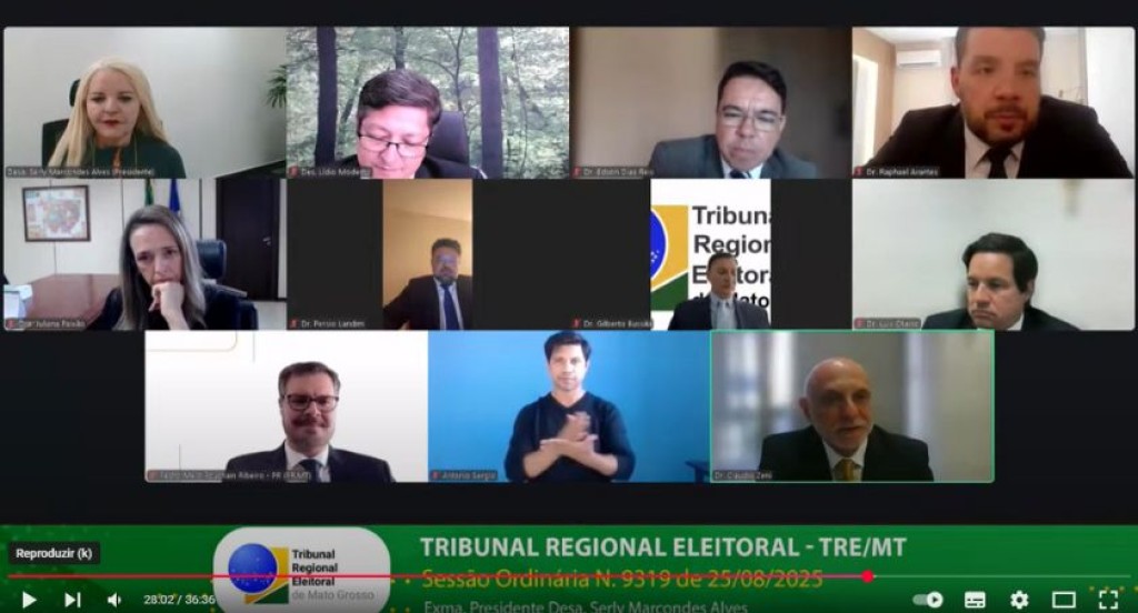 #PraTodosVerem: A imagem mostra uma sessão virtual do TRE-MT, realizada por videoconferência. Nela, vários magistrados, servidores e participantes aparecem em suas respectivas telas, incluindo a presidente da sessão, destacada na parte superior esquerda. Na parte inferior, há também a presença de um intérprete de Libras, garantindo acessibilidade à transmissão. Na faixa inferior da tela, consta a identificação do evento: Sessão Ordinária nº 9319, de 25/08/2025, presidida pela desembargadora Serly Marcondes Alves.