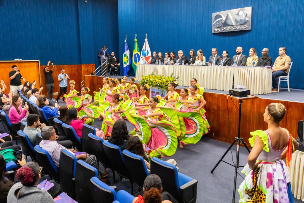 O grupo de dança do programa Simininas, da unidade do bairro Três Barras, e a primeira-dama e vereadora de Cuiabá, Samantha Iris, participaram da comemoração pelos 35 anos do Estatuto da Criança e do Adolescente (ECA), promovida pela Ordem dos Advogados do Brasil – Seccional Mato Grosso (OAB-MT).