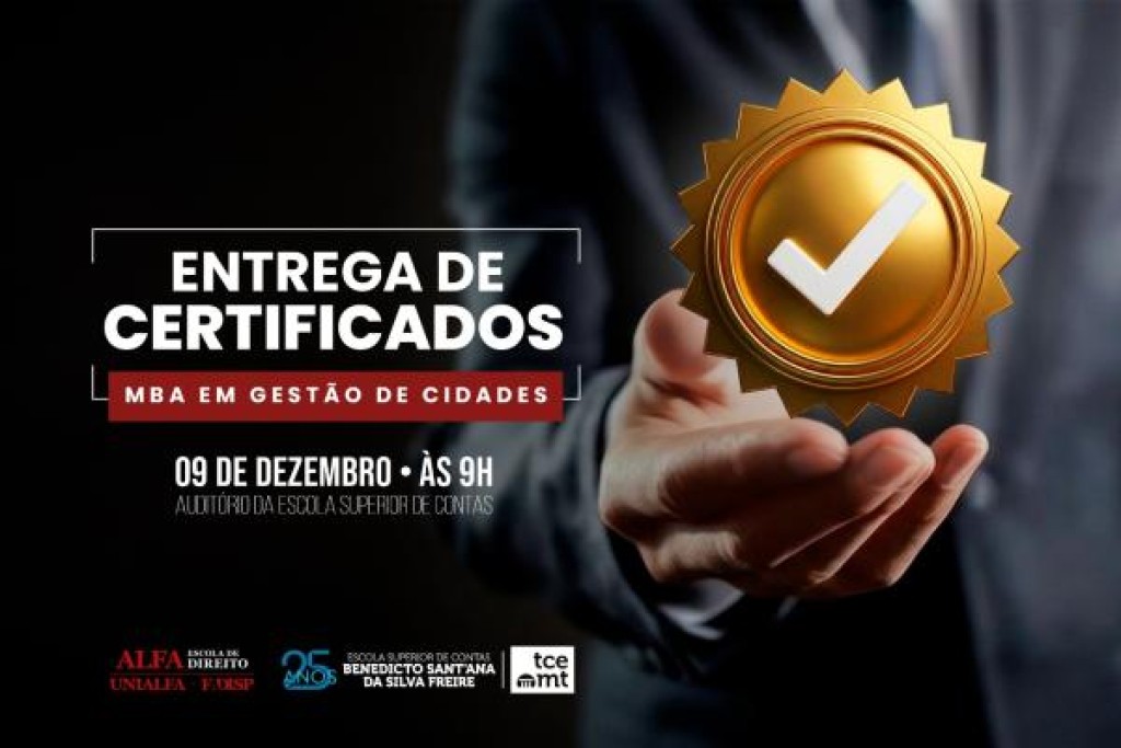 A solenidade de entrega dos certificados do MBA em Gestão de Cidades do Tribunal de Contas de Mato Grosso (TCE-MT) será realizada a partir das 9h desta terça-feira (9), no auditório da Escola Superior de Contas, com transmissão ao vivo pelo Canal do TCE-MT no YouTube e pela TV Contas (canal 30.2). O evento reunirá conselheiros, membros do Ministério Público de Contas, autoridades e os 375 alunos que concluíram o curso conforme os critérios definidos pela coordenação acadêmica.