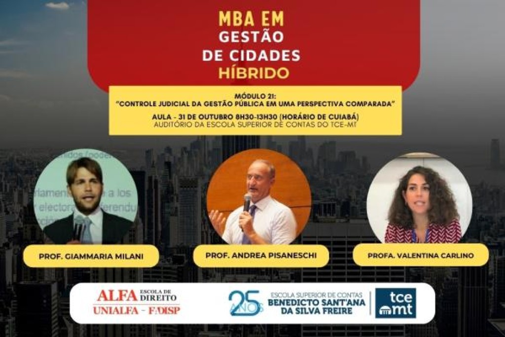 O Tribunal de Contas de Mato Grosso (TCE-MT) realiza, nesta sexta-feira (31), a partir das 8h30, o 21º módulo do MBA em Gestão de Cidades, com o tema “Controle judicial da gestão pública em uma perspectiva comparada”. A aula contará com a presença internacional dos juristas e acadêmicos italianos Valentina Carlino, Andrea Pisaneschi e Giammaria Milani, vinculados à tradicional Universidade de Siena, na Itália.