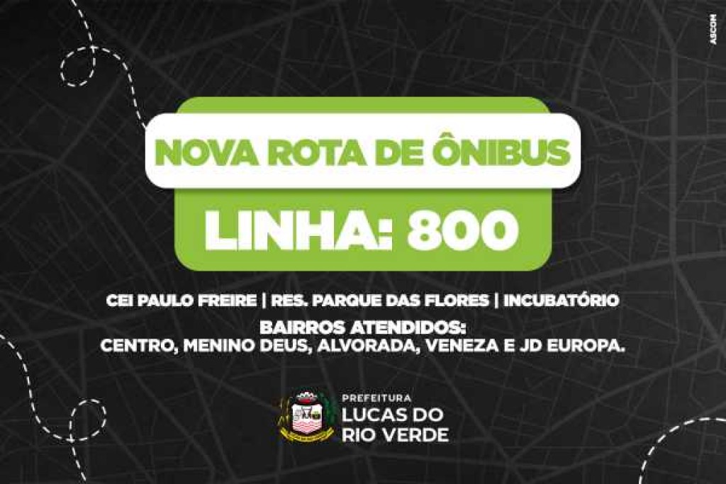 A partir do dia 2 de junho, a linha 600B do transporte coletivo de Lucas do Rio Verde será renomeada como linha 800 e ampliará o seu itinerário. Essa é uma iniciativa da Prefeitura, por meio das secretarias de Segurança Pública e de Desenvolvimento Econômico, Planejamento e Cidade, em busca de integrar mais regiões e atender a crescente demanda da população, sobretudo, nos entornos do Laboratório Municipal, do CEI Paulo Freire, do Residencial Parque das Flores e do Incubatório da BRF.