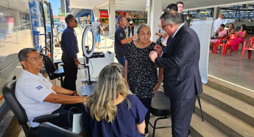 #PraTodosVerem: A imagem mostra uma ação de atendimento eleitoral em local público, onde uma equipe do TRE realiza o cadastramento biométrico de eleitores. No centro, o desembargador Marcos Machado, um homem de terno, conversa com uma eleitora idosa, enquanto servidores atendem outras pessoas em mesas com equipamentos de biometria. Ao fundo, há cadeiras com pessoas aguardando e uma unidade móvel da Justiça Eleitoral estacionada. No corpo do texto, tem a foto de um eleitor segurando o título que acabou de fazer e, ao final da matéria, tem mais fotos dos atendimentos feitos no local.