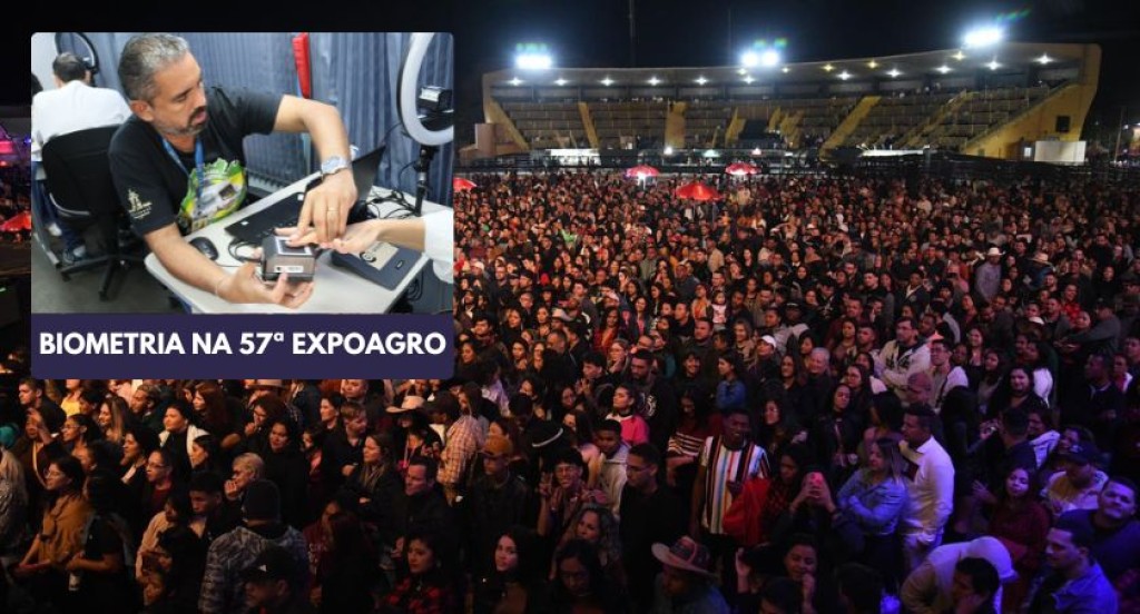#PraTodosVerem – A imagem mostra o parque de exposições com uma multidão reunida em frente ao palco, em um show na 57ª Expoagro. No canto superior esquerdo, há um destaque com a inscrição “BIOMETRIA NA 57ª EXPOAGRO”, acompanhado de uma imagem menor que mostra um servidor da Justiça Eleitoral realizando o atendimento biométrico de uma eleitora, capturando digitais com o uso de equipamentos específicos. A montagem sugere a presença do serviço eleitoral dentro do evento, aproximando a Justiça Eleitoral da população.
