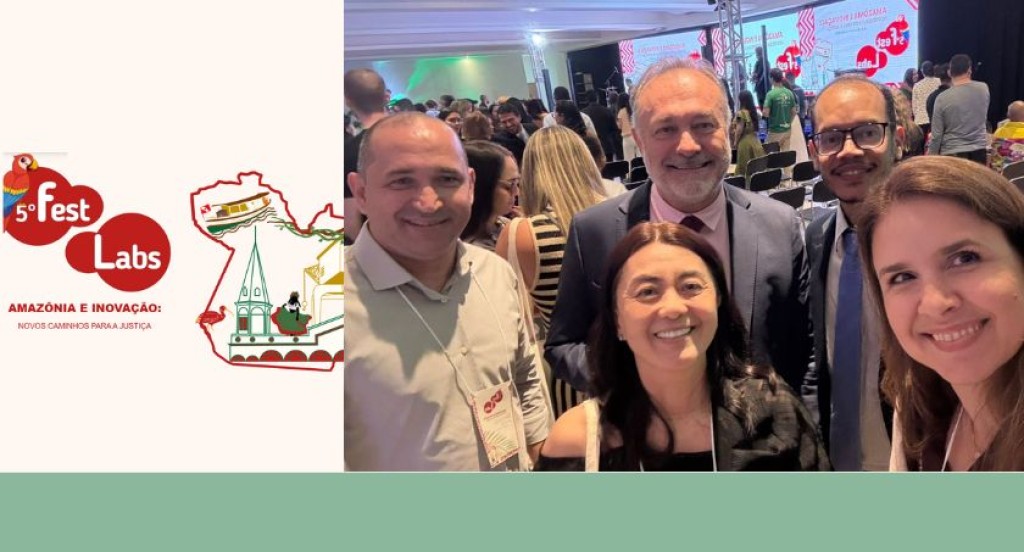 #DescriçãodaImagem: A imagem está dividida em duas partes. À esquerda, aparece a identidade visual do 5º FestLabs, com o logotipo em vermelho e branco acompanhado da frase “Amazônia e Inovação: Novos Caminhos para a Justiça”. A ilustração mostra elementos característicos da região amazônica, como o barco regional e a representação de pontos turísticos, reforçando o tema do evento. À direita, há uma fotografia de cinco representantes do TRE-MT sorrindo para a câmera durante o evento, em um ambiente de auditório cheio de participantes. Ao fundo, é possível ver o palco com o telão exibindo a marca do 5º FestLabs.